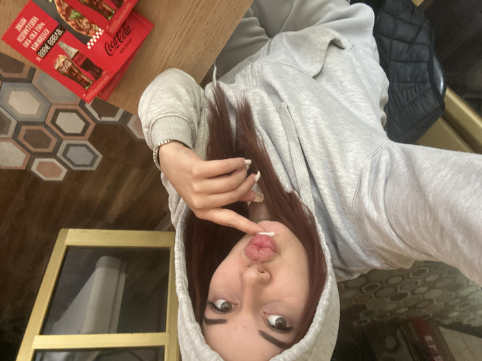 A young female, identified as the subject, is depicted in an indoor setting, likely a restaurant or cafe, specifically Pizza Ristorante "Kavalero" in Sliven, Bulgaria. She has long, reddish-brown hair, partially covered by a light grey hooded sweatshirt she is wearing. Her facial expression shows puckered lips, and her right hand, adorned with a bracelet and light-colored manicured fingernails, has the index finger touching her chin. To the subject's right, on a light wooden table, two red Coca-Cola branded flyers are visible. These flyers feature images of pizza and display Cyrillic text, including "АВТОМАТИЧНА" and the phone number "8888 888AB." A dark, possibly black, quilted jacket is on a chair to the subject's left. The floor is tiled with hexagonal patterns in shades of brown, grey, and light beige. A reflective surface with a golden frame is present in the background, showing a blurred reflection of a white object.