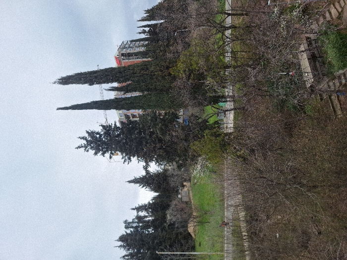 The image depicts an undetermined urban environment under an overcast sky. In the background, a multi-story building under construction is visible, characterized by exposed concrete structural elements and red material on its upper levels. A construction crane is positioned behind and to the left of this building. Numerous tall evergreen trees, including cypress and pine varieties, are prominent throughout the background and midground. In the midground, a paved road or pathway traverses horizontally. To the left of the road, an upward-sloping grassy area contains sparse trees and a visible street light pole. A single individual, dressed in dark red clothing, is observed walking on or adjacent to this road on the left side of the frame. To the right of the road, dense deciduous vegetation, largely bare, predominates, interspersed with a few trees exhibiting light-colored blossoms. The immediate foreground is characterized by a dense concentration of bare deciduous trees and shrubs. Towards the bottom right, a set of outdoor stairs, constructed from concrete or stone, descends. Adjacent to these stairs, a picnic-style table with benches is situated, partially obscured by surrounding vegetation. No specific interactions between individuals or with the environment are discernable beyond the pedestrian's movement. The overall impression suggests a late winter or early spring season due to the mix of bare and blossoming trees.