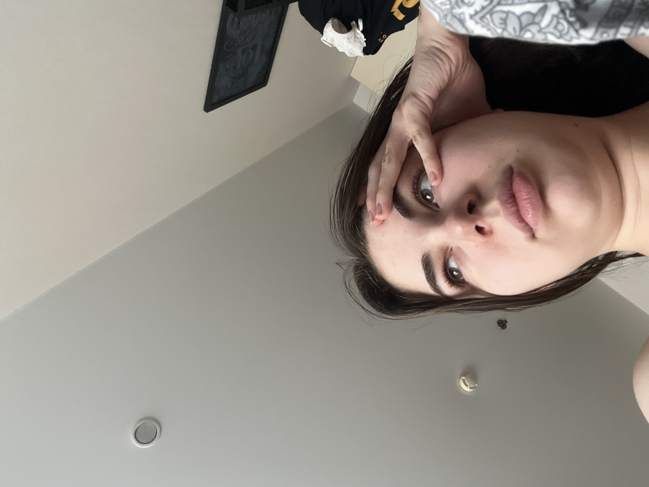 The image depicts a female individual in an indoor setting, likely a room, with the camera positioned at a low angle, looking upwards. The upper two-thirds of the frame are dominated by a white ceiling. Two recessed circular light fixtures and a white circular smoke detector are visible on the ceiling. In the upper right corner, a dark-framed rectangular object, possibly a mirror or a picture, is partially visible, mounted high on a wall or on the ceiling. Below this object, to the right, some folded clothing items are visible, including a piece of white fabric and a black garment with a yellow graphic design. The lower third of the image features the upper torso and head of a young adult female with dark hair. Her face is directed towards the upper left, with her eyes looking upwards. Her left hand rests on her forehead, with fingers slightly spread and the index finger near her left eyebrow. Her expression appears contemplative. The individual and environment are located in Saint Petersburg, Russia.