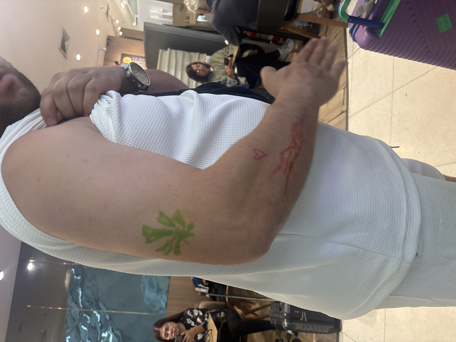 An arm extends into view, adorned with two distinct tattoos. A green, stylized plant-like design sits near the elbow, while a red, abstract figure, accompanied by a heart, decorates the forearm. The individual wears a white, textured shirt. The background is blurred, showing other individuals sitting and luggage. A purple suitcase is partially visible in the upper right corner. A silver watch is on the person's wrist.