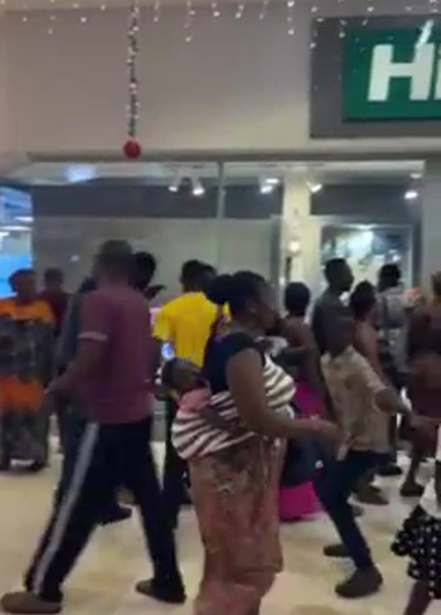group of people gathered in what appears to be a shopping mall. There are men, women, and children of various ages. Some of the women are carrying infants in wraps. The crowd is densely packed and appears to be excited, moving back and forth. The scene is lit by overhead lights, including decorative string lights. Behind the crowd is a storefront with a large "Hisense" sign. Other storefronts are visible in the background. Overall, the atmosphere seems festive and energetic.
