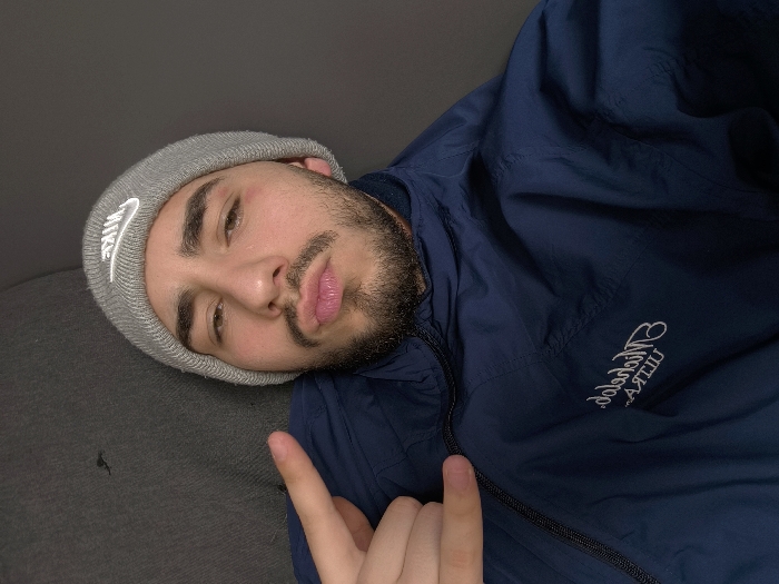 A male subject is depicted in a close-up, slightly tilted image, presumably taken indoors in the city of Schiltigheim, France. He is shown reclining against a dark grey upholstered surface, with a plain dark grey background. The subject wears a grey knit beanie featuring a white Nike swoosh logo on the front and a dark blue windbreaker jacket with a visible black zipper. A white, vertically oriented, mirrored "Michelob ULTRA" logo is embroidered on the jacket's left chest. He has a short beard and mustache. His lips are pursed, and his eyes are open, directed towards the camera. A reddish mark is visible on his right cheekbone. His right hand is raised, forming a "rock on" gesture with the index and pinky fingers extended. A small tear is present in the fabric surface beneath his head.
