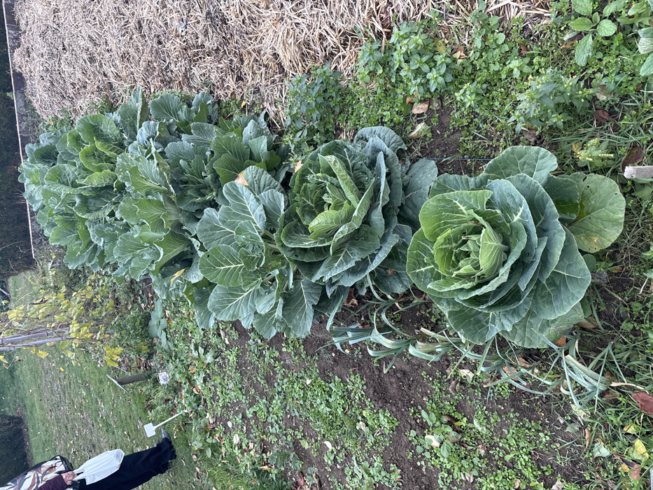 The image depicts an outdoor garden scene within the city of Mesnils-sur-Iton, France. A primary subject is a linear row of at least five mature Brassica plants, likely cabbages or collard greens, displaying large, deep green leaves. This row extends from the lower center towards the upper right. To the immediate left of these plants, a strip of tilled earth contains scattered small green plants and several vertically oriented leeks. Further left, a grassy pathway is visible, where the lower portion of an individual is present in the upper-left quadrant. This person wears dark trousers and footwear, and holds a white bag in their left hand; their interaction with the scene is limited to standing or walking. To the right of the Brassica row, a garden bed is covered with a layer of light brown straw or hay mulch, with some minor green plant growth emerging along its edge. Small white plant markers are discernible in the soil near the left edge of the garden. The background features additional grassy areas and deciduous plant foliage.