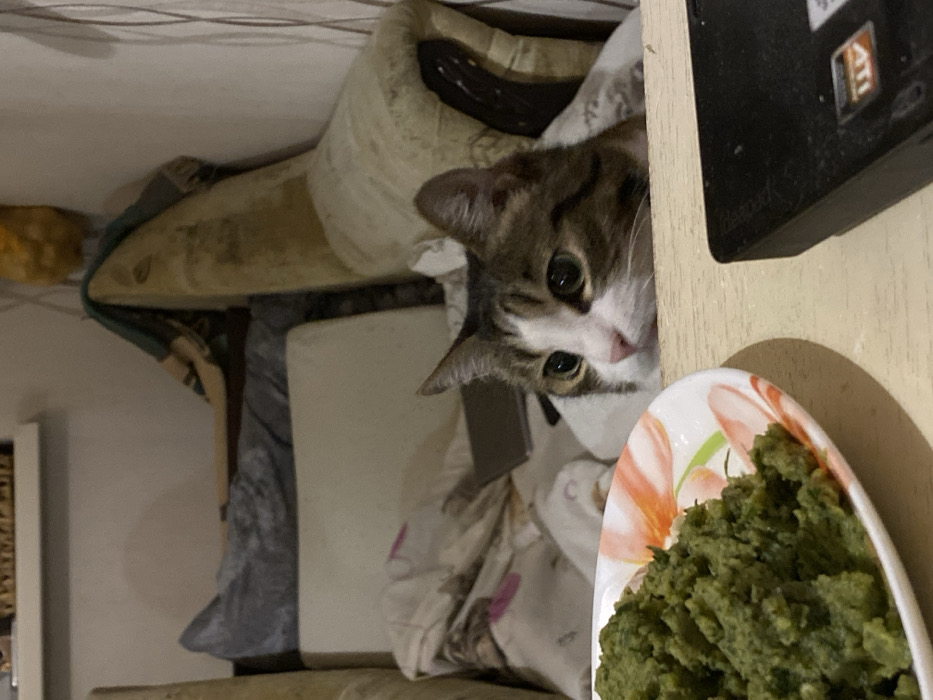 A tabby-and-white domestic cat with prominent dark tabby markings on its head and back, and a white muzzle and chest, is seen peeking over a light-colored wooden surface. Its large, dark eyes are fixed intently towards the lower-left foreground. Positioned on the wooden surface in the lower-left is a white plate featuring an orange floral design on its rim, filled with a pile of green, textured, mashed food. To the right, on the same wooden surface, the top-right corner of a black electronic device, possibly a laptop, is visible. The cat appears to be emerging from behind a heavily upholstered, beige armchair or sofa, which shows signs of wear. A rumpled, light-colored patterned blanket or sheet is visible within the armchair, along with a small dark rectangular object. The background consists of a light-colored wall with faint vertical patterns and a yellow, textured object near the top-right. The scene is indoors, in a residential setting within Балаклавский округ, Ukraine, under dim lighting conditions.