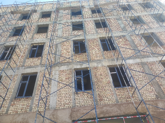 The image displays a multi-story building under construction in Jizzakh, Uzbekistan, viewed from a low-angle perspective looking upwards