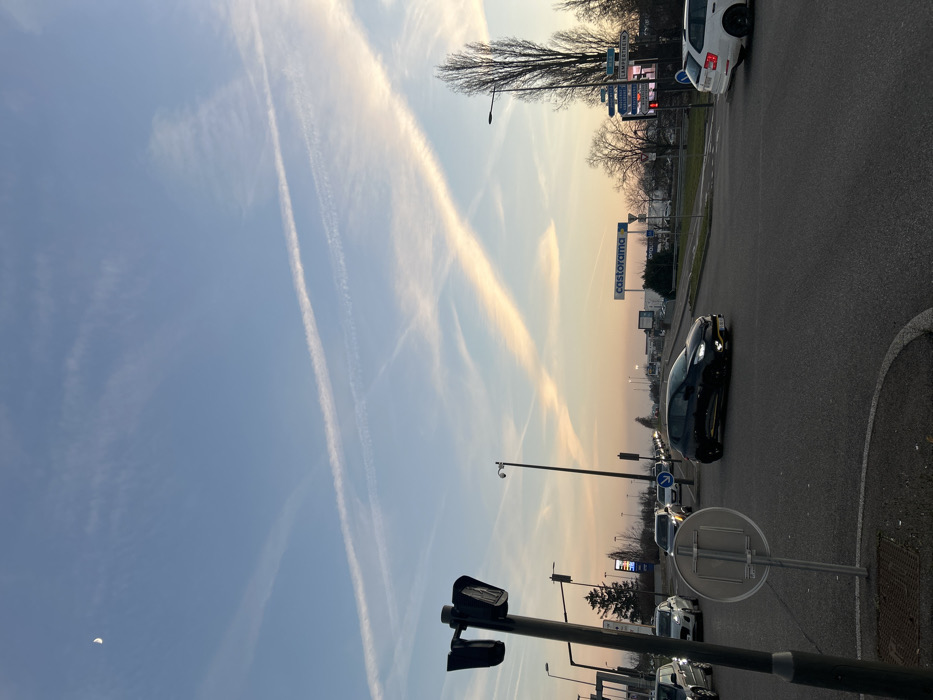 The image depicts an urban intersection in a commercial zone of Vendenheim, France, at twilight. The sky transitions from light blue overhead to orange and pink near the horizon, containing multiple intersecting white contrails. A slim crescent moon is visible in the upper left quadrant. In the immediate foreground on the left, a black traffic light pole is positioned, supporting two dark-colored traffic light heads. To its right, a white circular regulatory sign with a horizontal dark bar is mounted on a pole. On the asphalt roadway, a black Renault Clio, identifiable by yellow accents along its lower side panels, is positioned centrally within the intersection with its headlights illuminated, facing generally right. To the left of the intersection, a queue of light-colored vehicles, including white and silver cars, is visible on an approaching lane. On the far right, a white Skoda Octavia Combi is partially visible, positioned at the edge of the intersection. A tall street light pole, equipped with a surveillance camera, stands to the right of the foreground traffic light. Further right, a multi-directional road signpost displays destinations including "VENDENHEIM" and "LAMPERTHEIM." In the background, a large blue "castorama" sign is prominent on a commercial building, with other indistinct commercial signs visible below it. A line of bare deciduous trees is present along the horizon, behind the commercial structures.