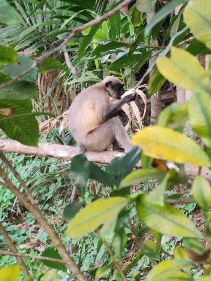 An adult Gray Langur (Semnopithecus entellus) is depicted sitting on a substantial horizontal tree branch in Querim, India. The monkey exhibits light tan fur on its torso and limbs, with a distinct black face. It is actively manipulating and consuming a pale, elongated food item with its left hand, while its right hand rests near the object. The surrounding environment is characterized by dense, varied green foliage, including broad leaves and smaller, lighter green leaves, creating a lush, natural setting. Blurred branches and leaves partially frame the subject in the foreground.