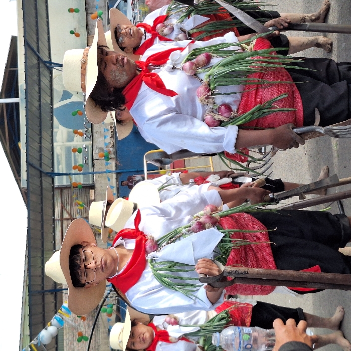 The image displays a group of at least seven individuals participating in an outdoor procession or cultural event in the city of José Luis Bustamante y Rivero, Peru. All participants are dressed in uniform attire, including wide-brimmed light-colored straw hats, white long-sleeved shirts, and red scarves tied around their necks. Each individual also wears a red mesh-like sash around their waist, from which hang green onions (scallions) and red onions. The individual in the immediate foreground is a young male wearing glasses, holding two long-handled agricultural implements resembling spades or hoes. To his right, another male has white powder or dirt smeared across his face and holds a multi-pronged tool, possibly a pitchfork. Several other individuals, including older men and women, are visible in similar attire, some appearing barefoot. Their expressions are generally neutral or solemn. The ground beneath them is a light-colored paved surface. In the background, structures include a building with a corrugated metal roof and a blue wall featuring a large white graphic. Decorative balloons in green, orange, white, and blue are strung in the background, suggesting a festive or public gathering. A human hand holding a clear plastic water bottle is partially visible in the lower-left corner of the frame. The scene is illuminated by bright daylight.