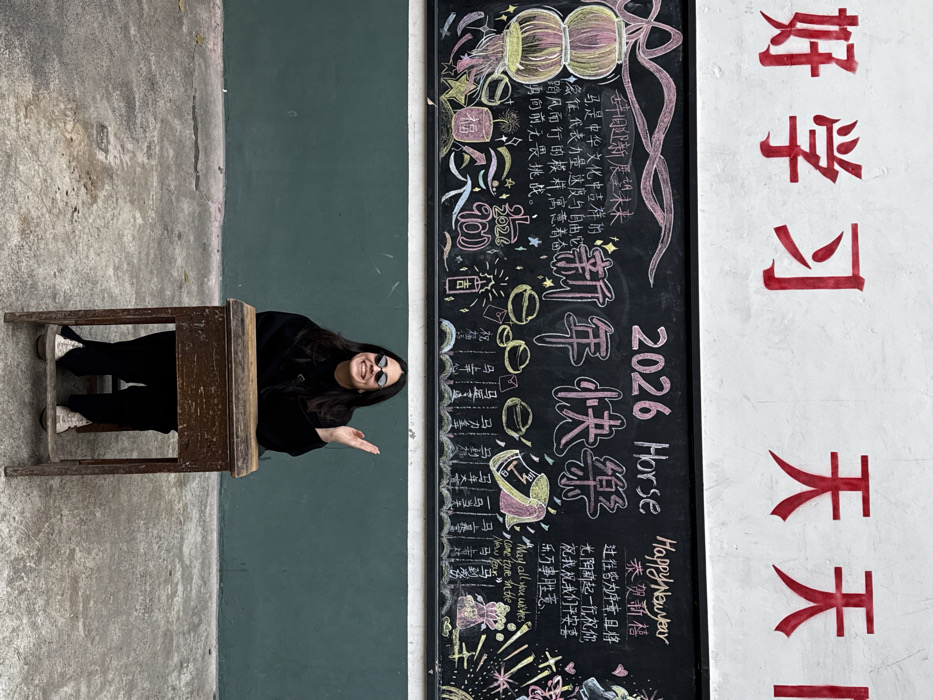 The image displays a female individual seated behind a worn wooden school desk in an outdoor environment in Yuzhong District, China. The subject, with long dark hair, is wearing dark sunglasses, a black long-sleeved top, black pants, and light-colored sneakers. She exhibits a broad smile and has her right hand raised in a gesture. Immediately behind her, a large blackboard displays elaborate chalk art and text. Prominent chalk text includes '新年快乐' (Happy New Year), '2026 Horse,' and 'Happy New Year' in English. The artwork features stacked lanterns, gold ingots, fireworks, and a calendar showing '2026.' Above the blackboard, a white wall is stenciled with large red Chinese characters reading '好学习 天天' (Study hard every day). Below the blackboard, a dark green wall forms the immediate background for the subject. The ground surface is light gray, textured concrete.