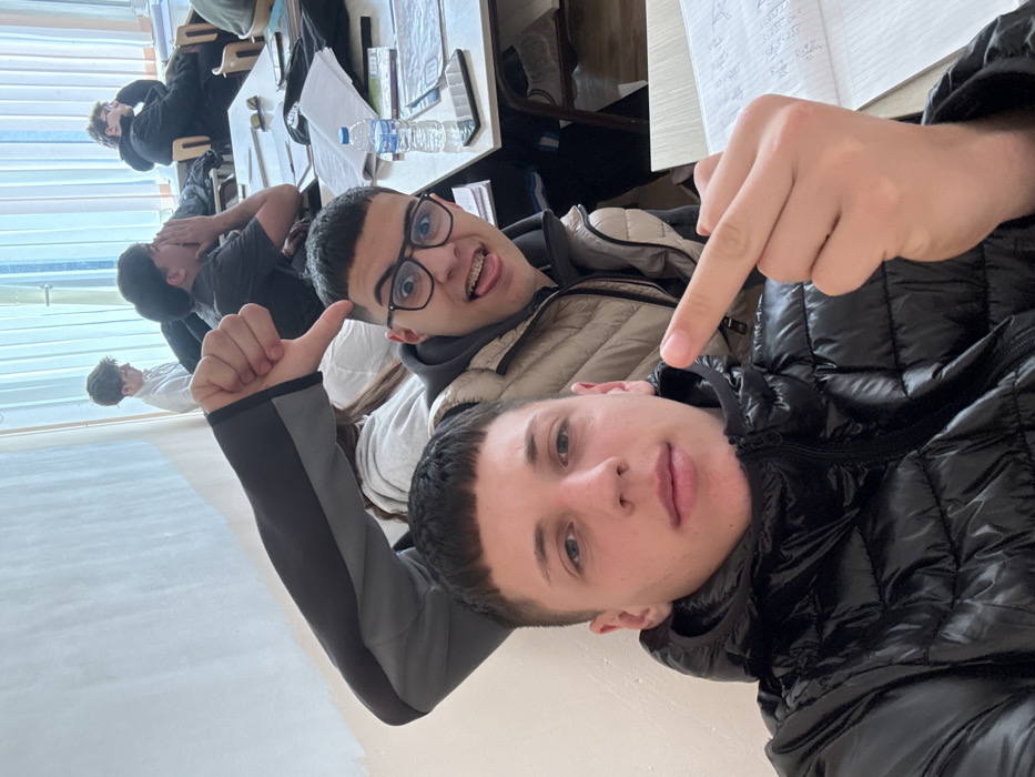 This image depicts a candid scene inside a classroom located in Pravets, Bulgaria. In the immediate foreground, a young male with short dark hair and a neutral expression is visible, wearing a shiny black puffer jacket. His right hand is raised, with the middle finger extended towards the camera. To his right and slightly behind him, another young male, wearing glasses and dental braces, displays a playful expression with his tongue extended and eyes wide. He is dressed in a beige puffer vest over a dark top, and his left hand makes a "thumbs down" gesture. Partially visible behind him is a person's arm in a light grey sleeve, making an inverted "L" shape with fingers. Several other young males are seated at wooden desks in the background. One individual in a white shirt is positioned near a window with vertical blinds, while another in a dark shirt is seen with hands covering his mouth. A third male in a dark jacket with glasses leans back in his chair near the window. The desks are light-colored and cluttered with notebooks, open textbooks showing handwritten notes, a blue plastic water bottle, and a dark-colored smartphone. The walls of the classroom appear light-colored, and natural light enters from the windows on the right side of the frame.