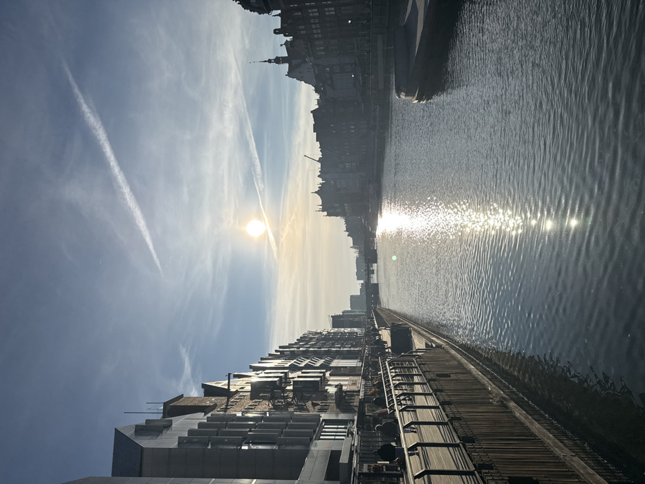 The image presents a daytime scene along the Motława River in Gdańsk, Poland, looking southeast. The sun, a bright circular disk, is low in the sky, positioned left of center, casting a strong, shimmering reflection across the river's surface. The sky is a clear light blue with two distinct, parallel aircraft contrails and scattered faint cirrus clouds. On the left, a modern wooden promenade with a black metal railing extends along the riverbank into the background. Approximately ten individuals and small groups are visible walking on this promenade. Behind the promenade, a row of multi-story buildings lines the bank; those in the foreground feature modern architecture with large windows and dark facades, while buildings further down exhibit more traditional gabled roofs and brickwork. The Motława River occupies the middle ground and right side of the frame, its surface rippled by the sun's glare. On the distant right bank, a continuous line of traditional European buildings with prominent gabled roofs and spires are largely silhouetted against the bright sky. A large construction crane is discernible amidst these structures. A dark, flat-topped barge or pontoon is moored near the right bank in the mid-ground. In the far distance, multiple bridges span the river, and additional urban architecture is visible on both sides.