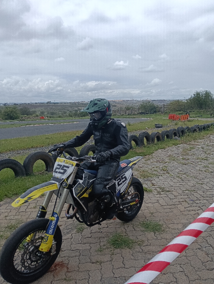- "A single individual, wearing a dark green full-face helmet with a visor and dark goggles, a black protective motorcycle suit, and black gloves, is seated on a black, yellow, and white Husqvarna supermoto motorcycle" by FM-E8rQG2, licensed under CC BY 4.0