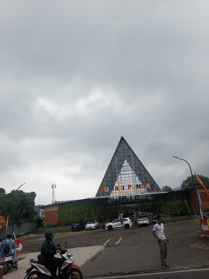 A daytime shot reveals a building with a large, triangular glass structure as its focal point, prominently displaying the words "SUMATI PUNCAK." Vehicles are parked in front, and lush greenery drapes the building's base. A man in a white shirt and khaki pants stands on the pavement to the right. A motorcyclist passes by on the left. The overcast sky casts a diffused light, lending a somewhat somber mood to the scene.