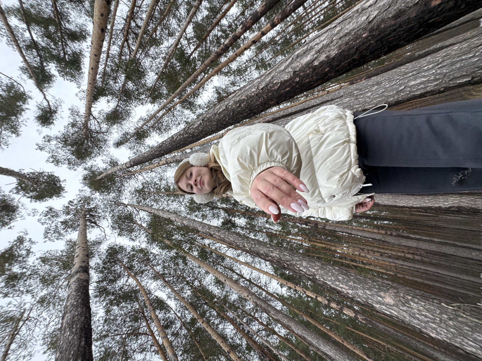 A low-angle, medium shot depicts a woman in an off-white puffer jacket and gray pants, standing in a forest of tall, thin pine trees that reach towards a cloudy sky. The trees, with their brown trunks, form a dense, upward-converging pattern. The woman is centered in the frame, slightly angled, and appears to be looking down towards the camera. She wears furry ear muffs. The location is a forest, suggestive of a natural area in or near the city of Chaikovsky, Russia.