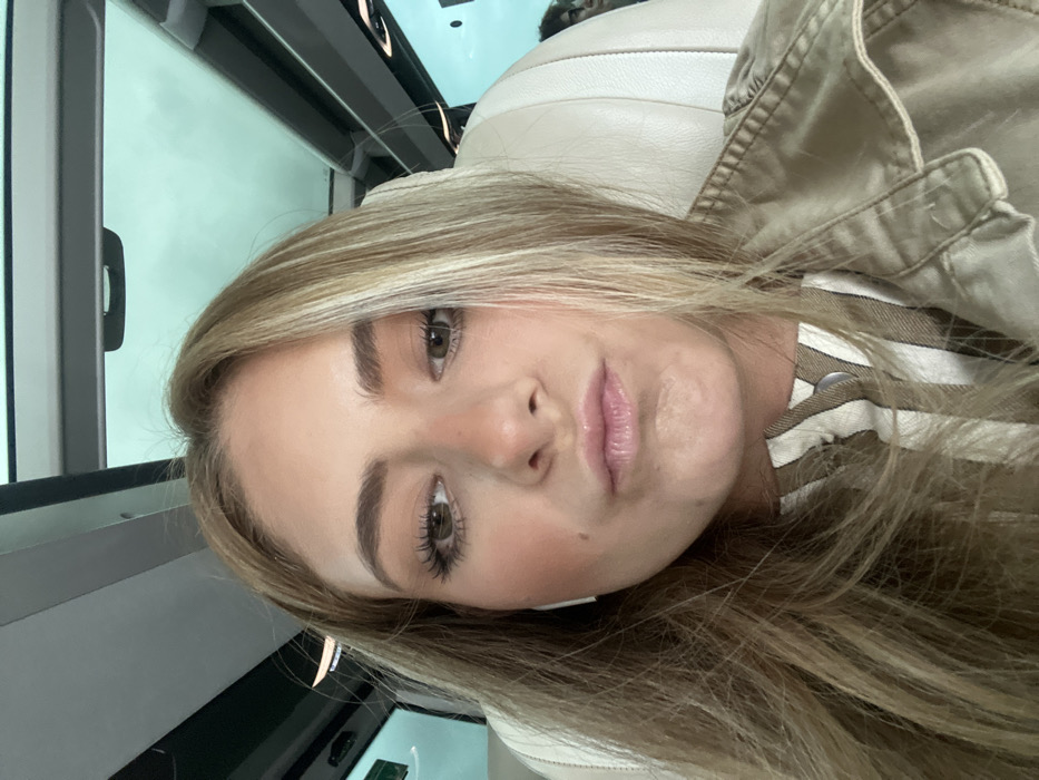 A medium shot depicts a single female subject inside a vehicle, identified as being in the city of Eibar, Spain. The subject, positioned centrally, has long, light brown and blonde hair and is looking directly at the camera with a slight pout. A white wireless earbud is visible in her right ear. She is wearing a light tan or beige collared jacket over a vertically striped garment with light and dark brown stripes. The immediate background reveals a light-colored, possibly leather, upholstered seat. Above the subject, an overhead panel with a light fixture or vent is visible. Through a vehicle window in the upper right background, an overcast sky with a greenish tint is discernible, along with a blurred dark form, consistent with a partial view of another person or object. The scene is a static portrait, with no active interactions depicted.