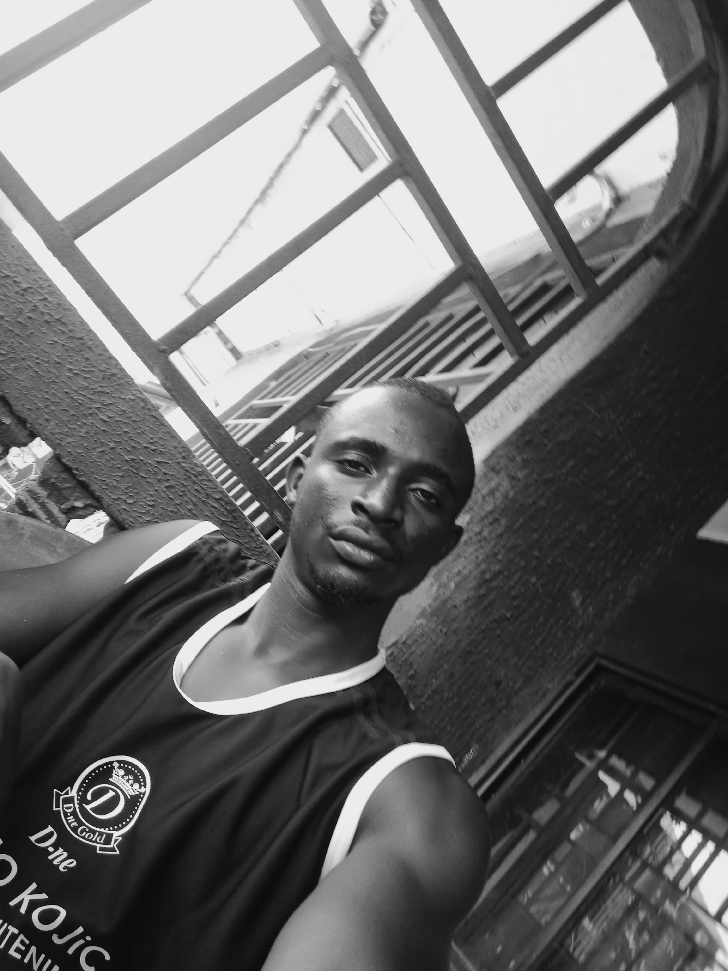 A black and white, low-angle, close-up photograph depicts an adult male of African descent, facing the camera with a neutral expression. He has short hair and visible stubble. He is wearing a dark-colored sleeveless top with white trim around the collar and armholes. The top features a prominent logo on the chest: a crown above a stylized letter "D" within an oval, flanked by text "D-ne Gold," with partially visible text "KOJIC WHITENING" below. The background primarily consists of architectural elements. Above and behind the subject, a large, dark-framed, multi-paned arched window or skylight structure is visible against an overexposed, bright background, likely sky or a brightly lit area. To the subject's left, a textured, rough wall or column appears. To the lower right, another framed glass structure, possibly a window or door, is partially visible and reflects light. The overall setting is consistent with an urban or semi-urban environment, potentially a balcony, veranda, or interior space. The image does not contain any specific visual cues such as landmarks, street signs, or unique architectural features that would allow for the identification of a precise location within the city of Onitsha, Nigeria.