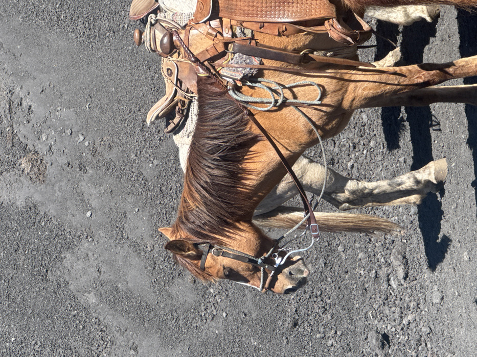 - "Captured from above, a brown horse stands saddled and bridled on a rough, dark gray surface" by FM-IdNfF2, licensed under CC BY 4.0