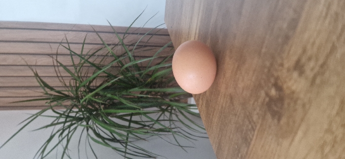 The scene depicts an interior setting, identified as being in Bridgwater, United Kingdom. A single, intact, light brown egg is positioned on a light brown wooden surface, which exhibits a subtle wood grain pattern. In the background, a houseplant with long, thin, green leaves is visible. To the right of the plant, a vertical panel composed of light brown wooden slats is present. A plain, light-colored wall occupies the upper left background. No individuals are depicted, and no specific actions or interactions are occurring.