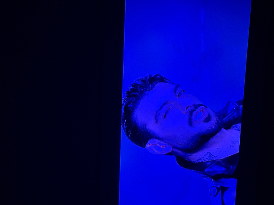 The scene depicts a male individual within the city of Strelcha, Bulgaria. The image is a photograph of a screen, displaying a close-up of a man's face and upper torso, illuminated by a dominant blue light. He has dark, groomed hair styled back, a short beard, and a mustache. His head is tilted slightly to the viewer's left, and his gaze is directed forward with a subtle, relaxed expression, lips slightly parted. Visible tattoos are present on the left side of his neck. He is wearing a dark garment, resembling a leather jacket, with a metallic chain visible around his neck. The background is a solid, vibrant blue, contrasting with the dark portions of the screen visible at the top and bottom of the frame. Reddish tones are noticeable on his ear and lips, a result of the blue lighting.