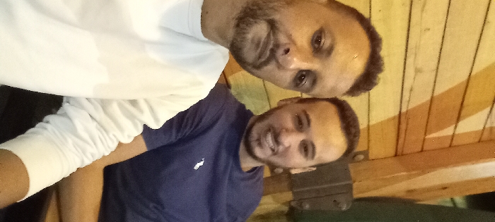 Two men pose closely together in a selfie-style image. One man is wearing a white sweatshirt and has a beard, standing above the other. The second man, positioned below, wears a blue shirt with a small white logo. Both men have dark hair and are smiling. The background features a wooden wall with vertical planks, suggesting an outdoor or rustic setting.