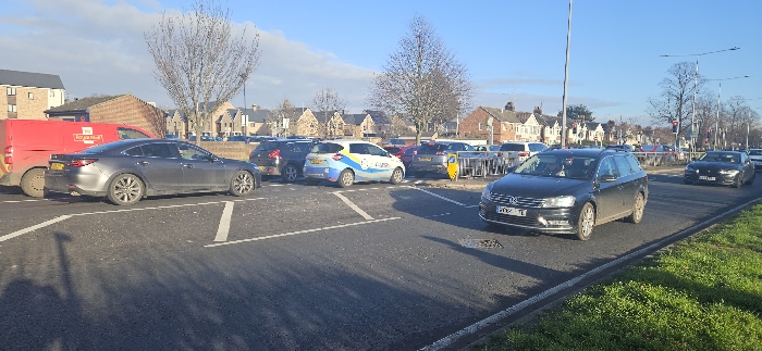 This outdoor image captures a car park entrance/exit area in Colchester, United Kingdom, under a clear blue sky with direct sunlight, suggesting daytime conditions in winter, given the bare deciduous trees. In the foreground, a dark grey Mazda 6 saloon, with a partially visible UK registration starting `GF66`, is positioned in what appears to be a maneuvering lane within a parking facility. It is located directly behind a red Royal Mail delivery van, also stationary, displaying the `Royal Mail` logo and a partial UK registration starting `BN70`. White painted lines delineate parking spaces and lanes on the asphalt surface. To the right, a black Volkswagen Passat estate car, visibly soiled, is driving on a paved road, moving from left to right. Its UK registration plate starts `PV12`. A green grass verge separates this road from the immediate foreground. Further down the road, another dark-colored saloon car is visible, following the Passat. The mid-ground features a densely occupied car park. A distinctive light blue, white, and yellow-liveried compact car is parked facing right, surrounded by numerous other parked vehicles. A yellow parking payment machine and a sequence of metal security barriers are visible near the car park's entrance. The background consists of residential buildings, including traditional terraced houses with pitched roofs and a taller, multi-story apartment block, consistent with a UK urban or suburban environment. Bare trees are scattered throughout the background. In the distance, traffic lights on a main thoroughfare are visible, displaying a red signal. No individuals are discernible within the frame.