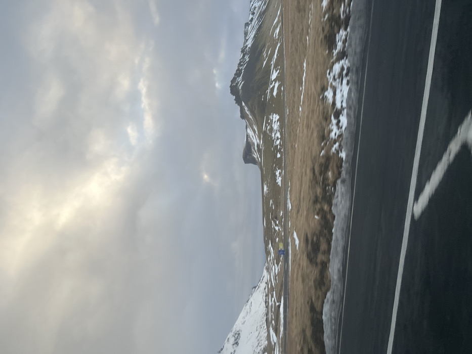 The image presents a wide, winter landscape under an overcast sky, viewed from a low perspective, likely from a moving vehicle. In the immediate foreground, a dark asphalt road occupies the bottom quarter, featuring a solid white lane line on the left and a faded, broken white line originating from the bottom center. A snow-dusted verge with patches of dry, light brown grass separates the road from the midground. The midground consists of expansive, undulating terrain covered primarily in dormant, light brown grass interspersed with significant patches of snow. In the central distance, two distinct, brightly colored objects, one blue and one yellow, are visible on the grassy terrain, appearing to be tents or temporary shelters. The background is defined by mountainous formations. To the left, a substantial hill or mountain is heavily covered in snow. To the right, a rugged mountain range displays patches of snow against exposed dark rock, notably featuring a flat-topped, cliff-like structure on its left side. The sky is uniformly overcast with varying shades of gray, showing brighter, lighter gray areas indicating diffuse sunlight attempting to penetrate the cloud cover. The scene is situated in the vicinity of Vik, Iceland.