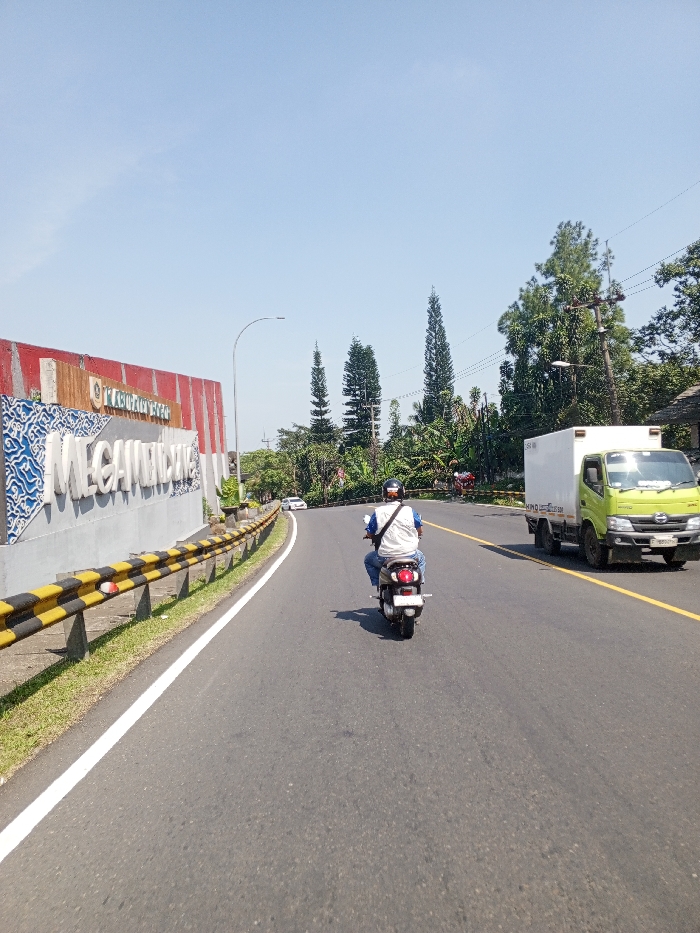 The scene, located in the city of Multhan, India, displays a paved two-lane road under a clear blue sky. On the left side, a large monument-style sign features raised white lettering that reads "MALANG CINEGERE" with partially visible "KEBON TEH" above it, set on a background combining red, wood-like textures, and blue traditional patterns. A yellow and black striped guardrail runs along the road's shoulder adjacent to the sign. In the foreground, a person wearing a white vest over a blue shirt, blue jeans, and a dark helmet operates a dark-colored scooter, traveling away from the viewer. In the opposing lane, a light green Hino truck with a white box trailer approaches. Further down the road on the left, a white sedan is partially visible. The environment is characterized by abundant green vegetation, including tall, conical trees and dense foliage on both sides of the road, with utility poles and power lines present on the right.