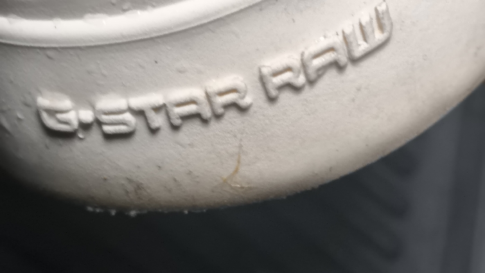 The scene is located in the city of Slanchevo, Bulgaria. The image presents a close-up, oblique view of a textured, off-white surface, consistent with the sole or side of a shoe. Embossed on this surface are the words "G-STAR RAW" in a sans-serif typeface, raised slightly from the background material. Below the "G-STAR" portion of the text, a thin, light brown, curvilinear fiber or superficial crack approximately 2-3 cm in length is present on the surface. The immediate background is dark and out of focus, providing no discernible details beyond suggesting a shallow depth of field. No individuals, overt actions, or interactions are visible.