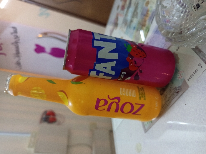 This image, originating from Rukn ad-Din Municipality, Syria, displays a static indoor scene focused on two commercial beverage containers resting on a light-colored surface, likely a table. **Subjects/Objects:** 1. **Yellow Bottle**: A tall, transparent bottle containing a yellow liquid, labeled "Zoya MANGO" in purple text. The label also indicates "REFRESHING SIZZLING SENSATION" and "VIT C," accompanied by illustrations of sliced mangoes and green leaves. 2. **Pink/Red Can**: A standard aluminum beverage can, primarily pink or reddish-pink, labeled "FANTA" in white and blue text. The word "fruity" is also present, alongside graphics of strawberries, other berries (possibly raspberries or cherries), and liquid splash designs. 3. **Paper Document**: Beneath both beverages, a white piece of paper, resembling a receipt or banknote, is partially visible. Visible alphanumeric characters include "D 1814399" and "23". 4. **Glass Object**: To the immediate right of the Fanta can, a clear, molded glass object with a textured, possibly faceted, surface is partially visible, consistent with an ashtray. 5. **Background Elements (Blurred)**: The background is out of focus. To the left, a white appliance or object with minor red elements is discernible. To the right, a white surface, possibly a wall or large object, features indistinct Arabic script and a distinct purple silhouette of a cat. **Actions/Interactions:** None; the objects are stationary. **People:** No individuals are present in the frame. **Environment:** The setting appears to be an interior space, illuminated by ambient light.
