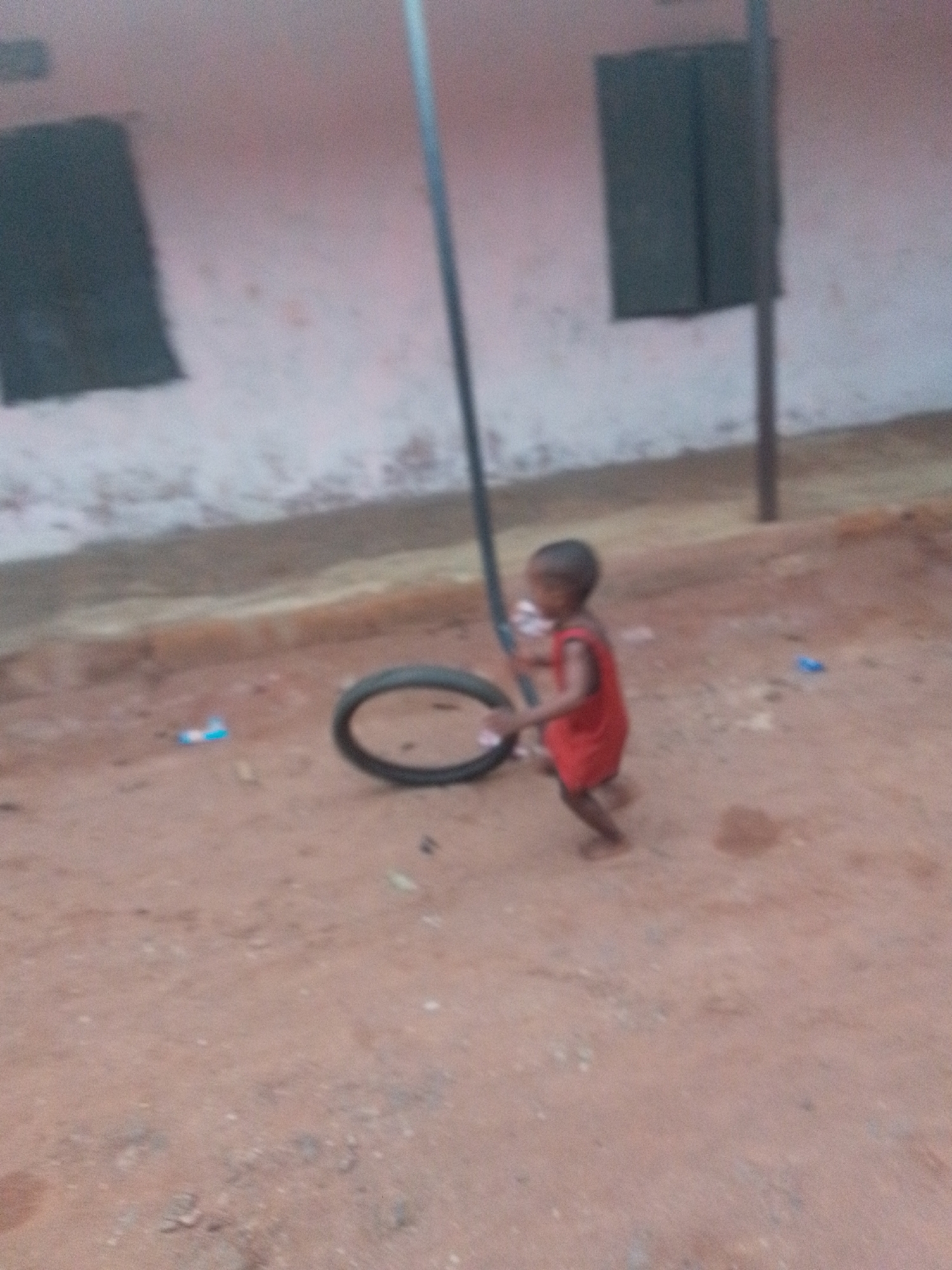 A young child stands next to a tire swing in what appears to be a yard or open area. The child is wearing a red garment. The swing consists of a tire hanging from a dark-colored pole. The ground is a reddish-brown dirt. A building is visible in the background. The location is Unknown, Unknown.