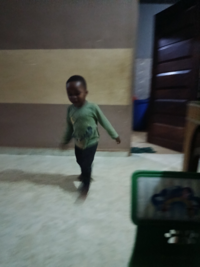 - "A young child wearing a green long-sleeved shirt and black pants is walking inside a room" by FM-xQ01I3, licensed under CC BY 4.0