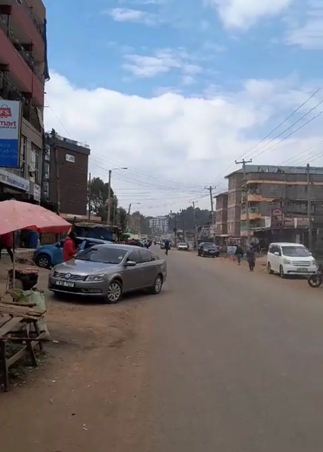 street scene in what appears to be a town or city in Africa. The road is paved, but the shoulder has a dirt section. There are several cars parked on the side of the road, including a silver Volkswagen Passat. People are walking along the sidewalks and the road. Buildings line both sides of the street. Overhead, there are numerous electrical wires. The sky is blue with white clouds. The weather looks sunny. There's an outdoor vendor with a pink umbrella on the left. In the background, there is a hill or elevated area. The audio contains music, likely originating from a vehicle or business nearby.