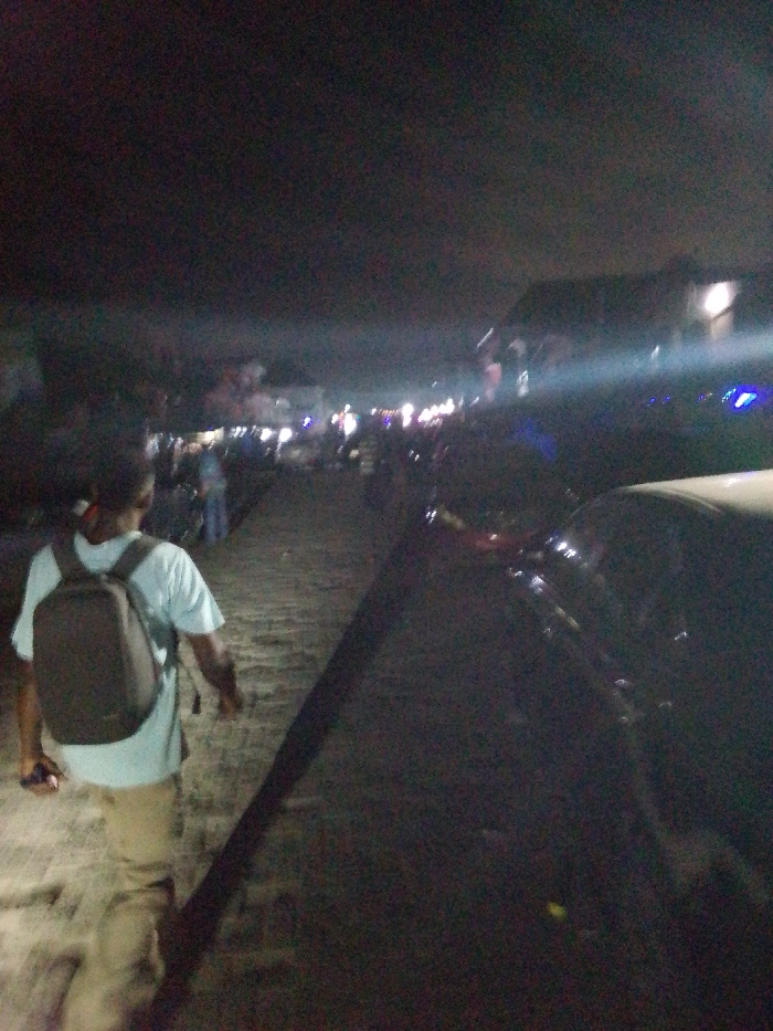 A man wearing a light blue t-shirt, khaki pants, and a dark backpack walks on a brick sidewalk at night. He holds an object in his right hand, possibly a phone. A dark object, possibly a car, is parked to his right. In the background, blurry lights suggest a street scene with other people visible further down the sidewalk. The overall lighting is dim, making details indistinct. The sky is dark.