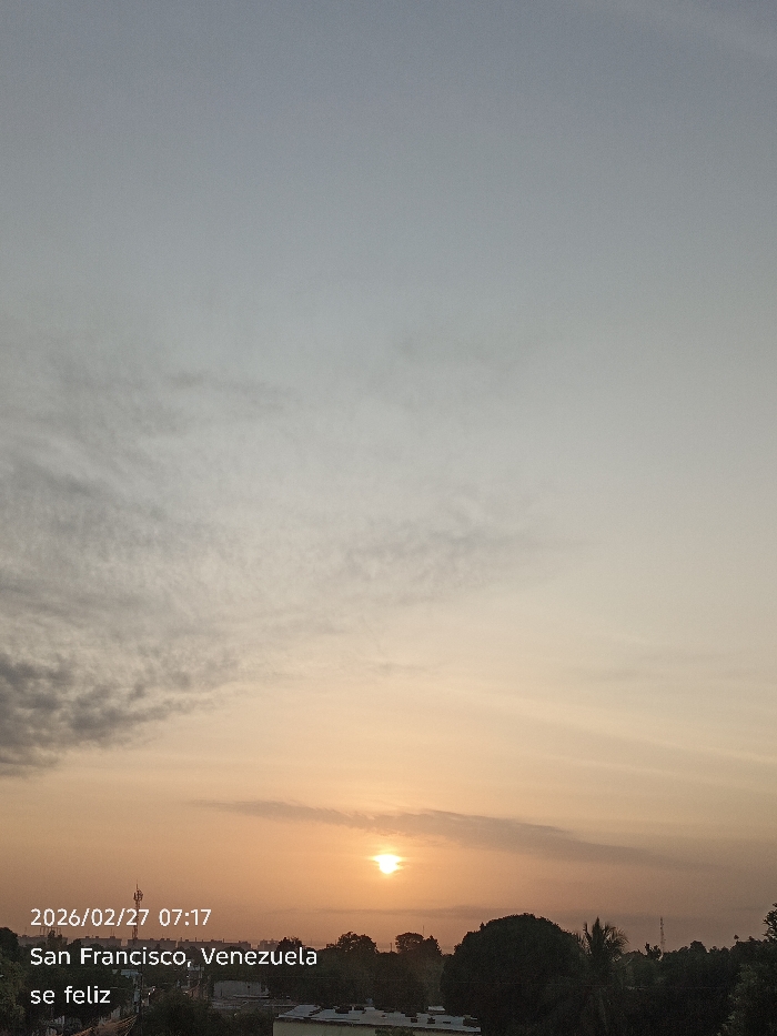 This image, captured on February 27, 2026, at 07:17, depicts a sunrise over San Francisco, Venezuela