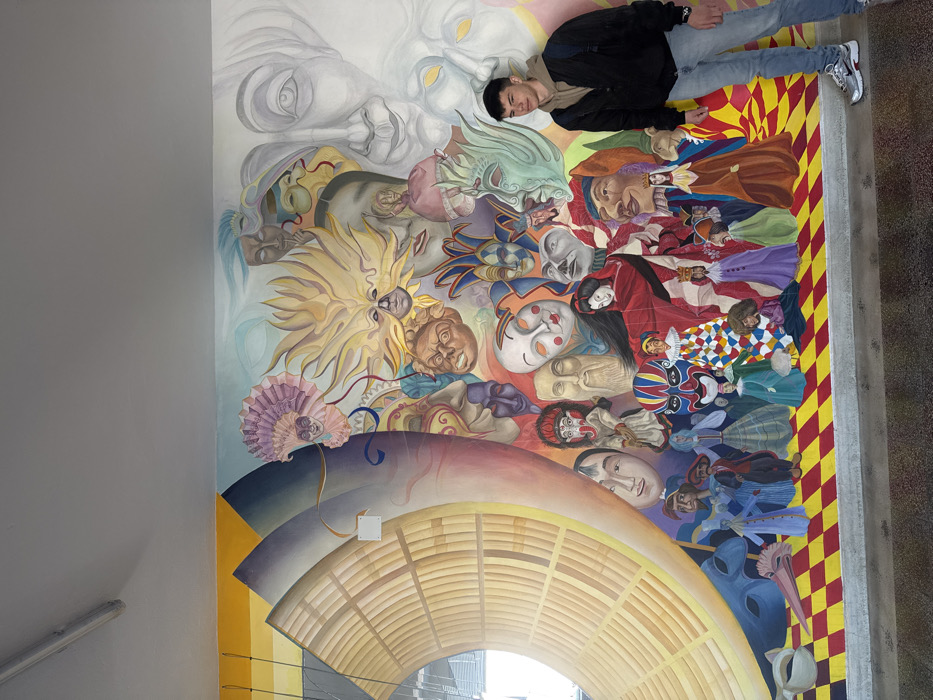 The scene depicts a young male standing to the right of a large, colorful mural on a wall inside the Palace of Culture and Sports in Veliko Tarnovo, Bulgaria