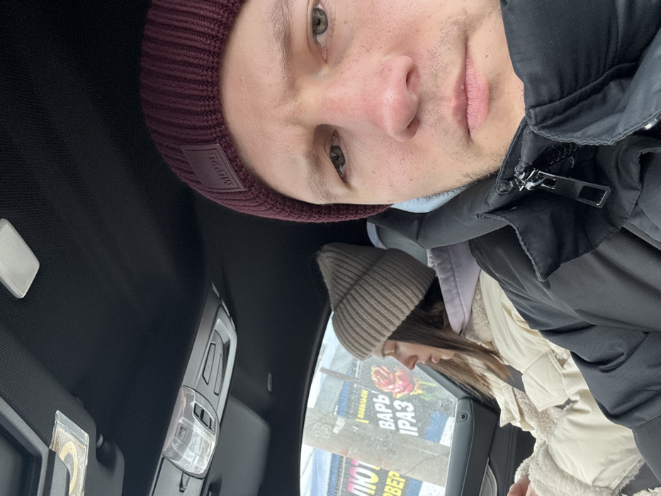 A selfie taken inside a car shows two people. The individual taking the picture is a man wearing a maroon beanie and black jacket. He has light skin and stubble. Behind him, a woman sits by the window, wearing a light brown beanie and beige jacket. A shop with text in a Cyrillic script is visible outside the window. The car's interior, including the ceiling light console, is visible.