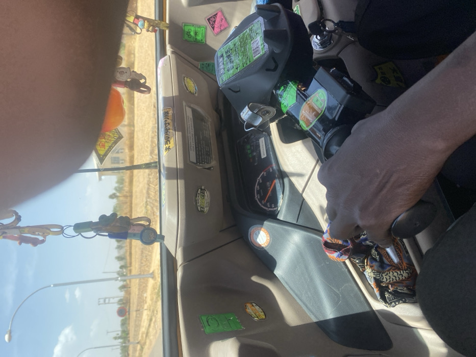 The image provides an interior view from a vehicle, likely an auto-rickshaw or tricycle, looking forward through the windshield on a bright, sunny day in Gwafan, Nigeria. A dark-skinned individual's right arm and hand are visible in the lower-middle frame, gripping a black handlebar-style steering control. The vehicle's tan-colored plastic dashboard is prominent, featuring an instrument cluster with a speedometer needle resting near zero, and various illuminated indicator lights. A key is inserted into the ignition on the right side. An auxiliary black device, potentially a phone holder, is mounted on the steering column, with a green-labeled item visible inside it. The dashboard and interior panels are adorned with multiple stickers, some displaying Japanese text, and others featuring graphic symbols such as a bicycle and an eye. A string of colorful keychains and decorative charms, including an orange spherical object, hangs from the ceiling area. A patterned, multi-colored cloth, possibly a head wrap, is tucked into a storage compartment on the left side of the dashboard. Outside the vehicle, a paved road extends into the distance, flanked by dry, yellowish fields under a clear blue sky. A street light pole stands on the left, with additional utility poles and a distant, light-colored building visible further down the road.
