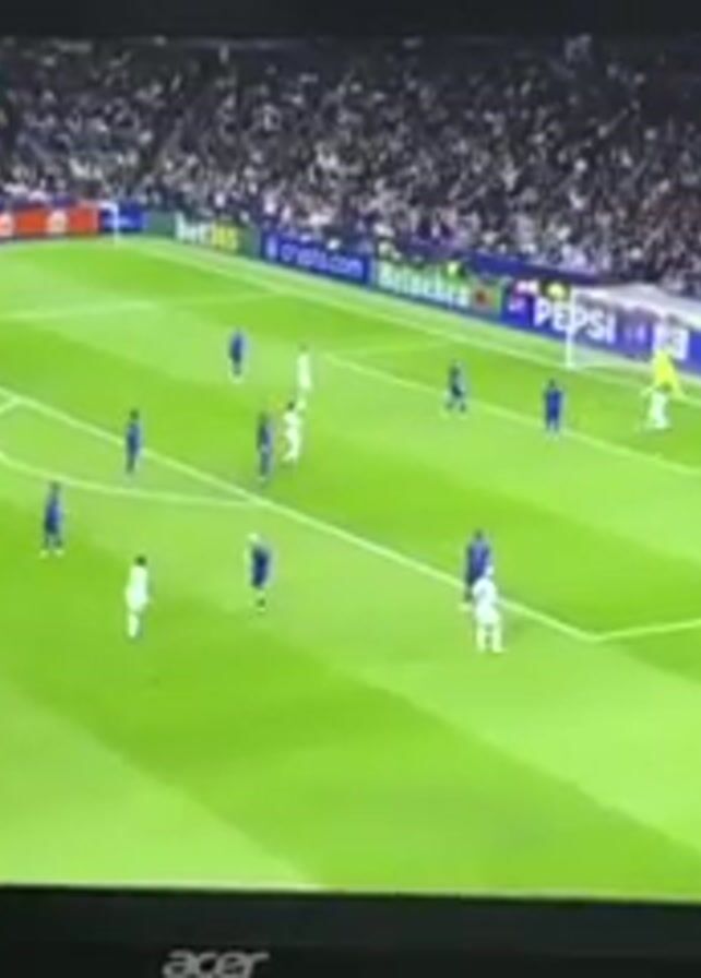 A soccer game is being viewed on an Acer laptop. The score is Real Madrid 2, Monaco 0. The time on the screen reads 45 minutes and 13 seconds with 2 minutes of extra time added. The soccer game appears to be a UEFA Champions League game. The camera pans to show the crowd clapping in the stands.