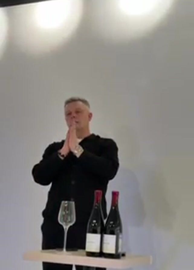person presenting in front of a white wall with three spotlights above. A table in front of them contains a wine glass and two bottles of red wine. The speaker gestures with their hands while talking. They are wearing a black cardigan and dark trousers. The environment appears to be indoors, possibly a seminar room or presentation area.