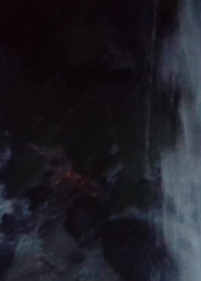 small waterfall flowing over dark, mossy rocks. The water is white and foamy, and there is a hand visible in the frame briefly at the start. The surroundings appear dark and possibly enclosed, suggesting a cave or grotto-like setting. The camera movement is somewhat shaky.