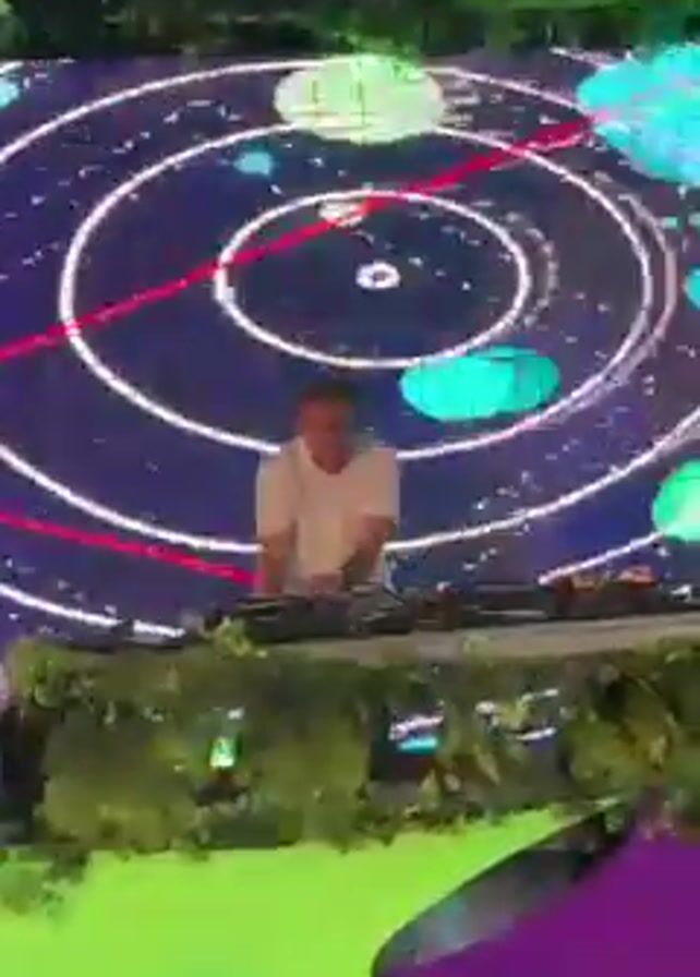 A person is DJing on a stage with a large screen behind them displaying abstract designs. The stage is decorated with greenery. A photographer in a cap, t-shirt, and shorts is taking photos of the event from the ground. The ground is decorated with green and purple designs. The video is taken at an outdoor event.