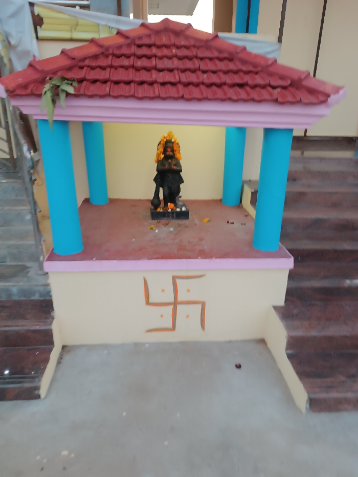 This image, captured in Koyalaguttapalli, India, displays a small, open-air shrine. The shrine features a red-tiled, four-sloped pyramidal roof supported by four light-blue columns. The elevated base of the shrine has a light peach-colored platform, upon which a dark-colored statue of a deity stands upright. The statue is adorned with a prominent yellow and orange floral garland and its hands are in a respectful gesture. A mace-like object is visible beside its left leg. Small white, yellow, and red floral offerings, along with specks of powder, are scattered on the platform in front of the statue. The front face of the shrine's base is light beige, featuring a painted orange clockwise Swastika symbol with four interior dots. The ground directly in front of the shrine is concrete. Dark reddish-brown tiled steps ascend on both the left and right sides of the shrine, suggesting access to a higher elevation or adjacent structure. A few green leaves are draped over the left edge of the red roof. The background is blurred, showing parts of a light-colored building. No people are visible in the scene.