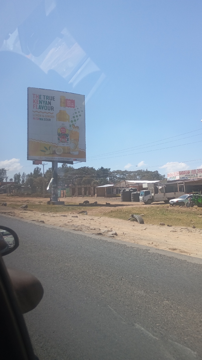 A roadside scene shows a large billboard advertising "The True Kenyan Flavour" with a lemon and ginger drink