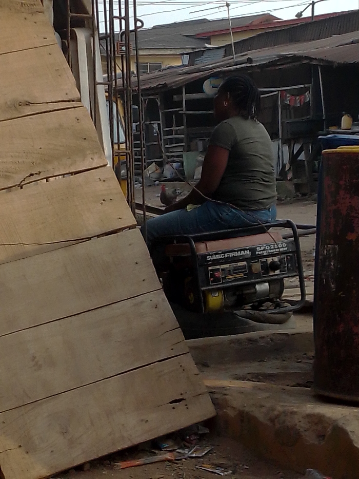 A woman sits on a "SUMEC FIRMAN SPG2500" petrol generator in an outdoor setting. She wears jeans and a t-shirt. Fenced structures and buildings are visible in the background. A stack of wooden planks is to the left, while a red and black barrel stands to the right. Debris litters the ground.