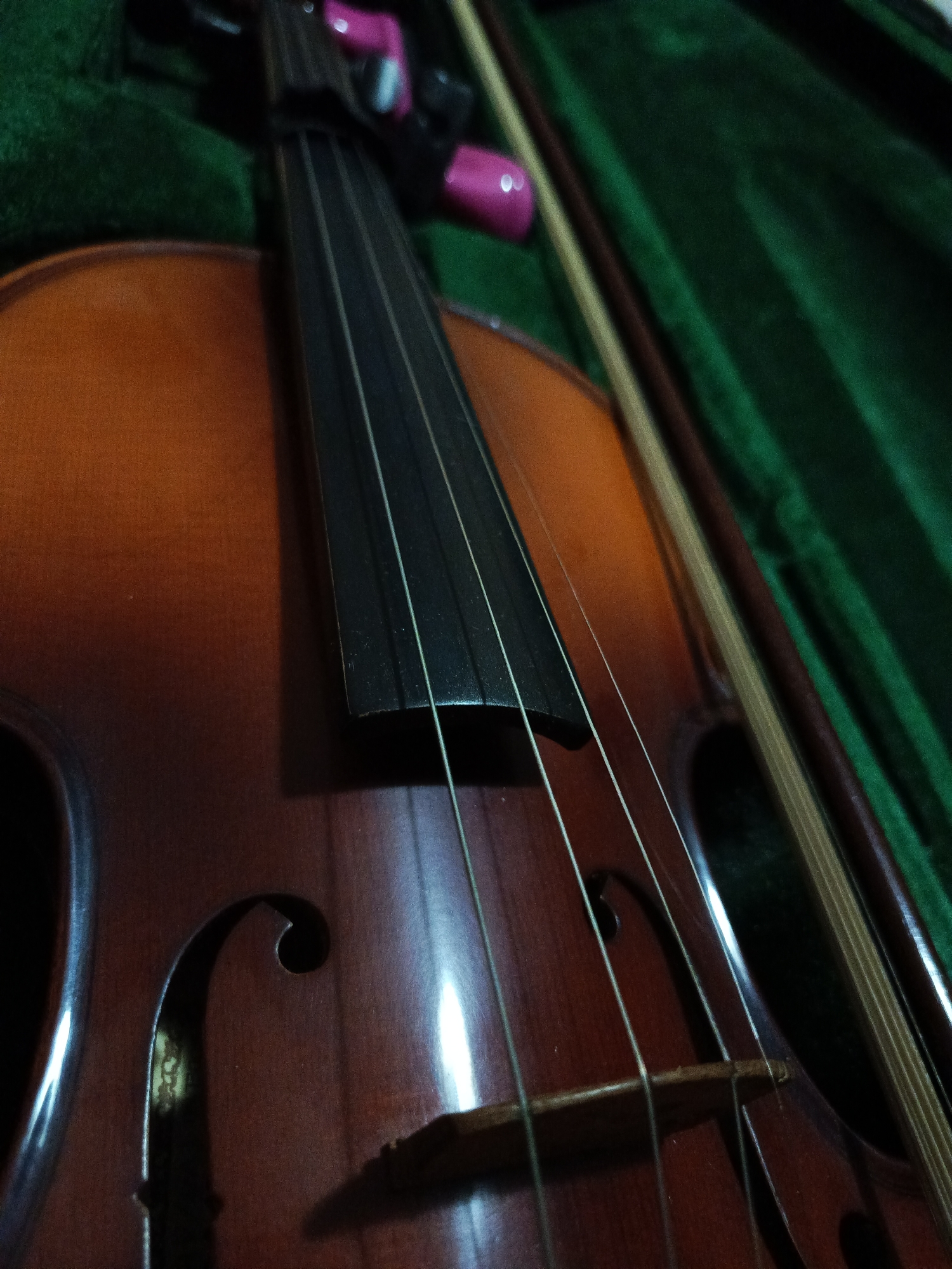 close-up view of a brown violin inside a green case
