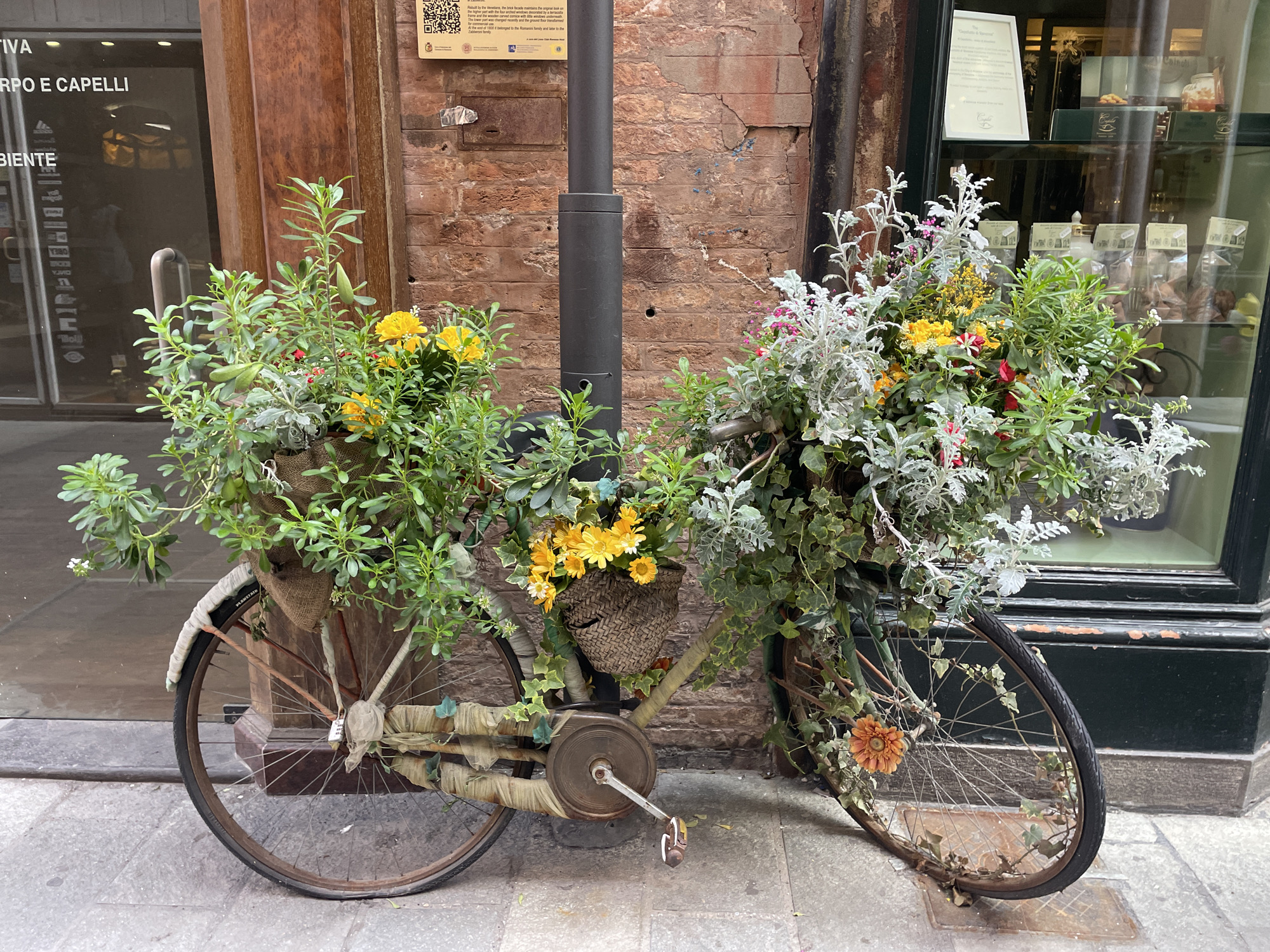 A bicycle is decorated with plants and flowers and parked against a building in Ravenna, Italy