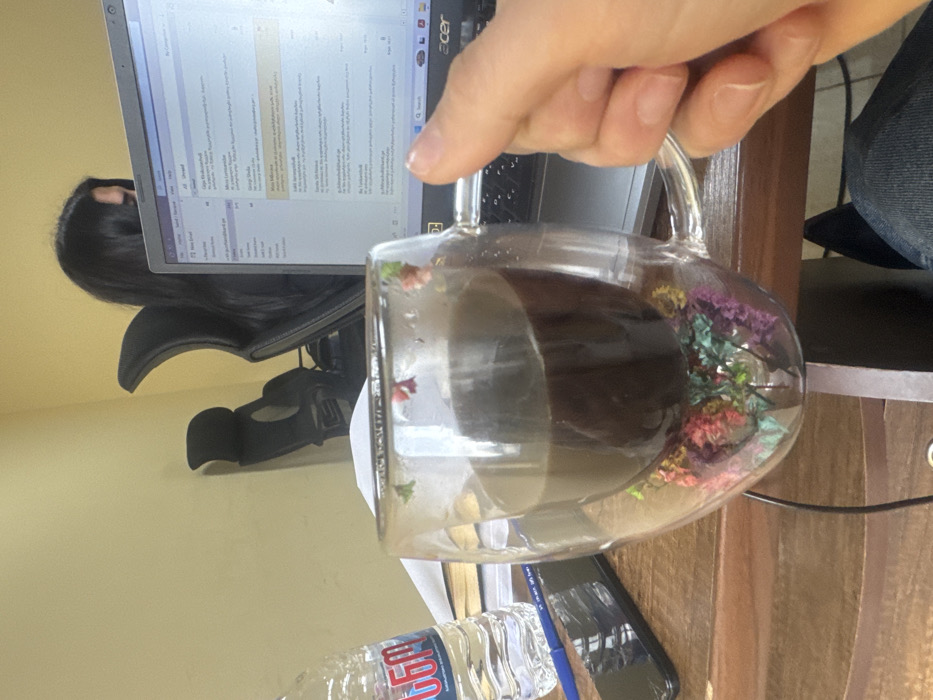 A clear glass mug with a handle, filled with dark liquid and colorful dried flowers, is held in a hand. A laptop sits in the background, partially obscured by a person with long black hair. A water bottle and a smartphone are visible on a desk with a wooden surface. A black office chair is also visible.