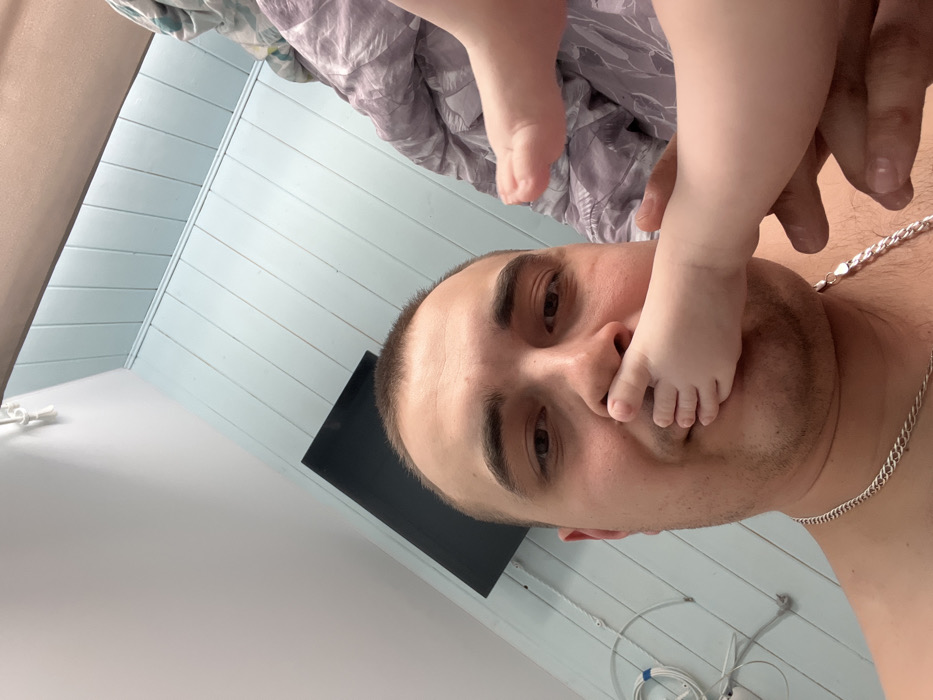 In an indoor setting within Razdol'e, Russia, a Caucasian adult male with short dark hair and light facial stubble is depicted in a close-up, looking directly at the camera. He wears a silver-colored link chain necklace. An infant's bare left foot is pressed against the bridge of his nose and upper lip. The male's right hand supports the infant's leg. A second infant foot is visible above and to the right of the first. The background features a light blue wall with vertical wood paneling. A wall-mounted, black flat-screen television is positioned in the upper left background, below which white coiled cabling is visible. Crumpled bedding, light purple and grey in hue, occupies the right side of the frame.