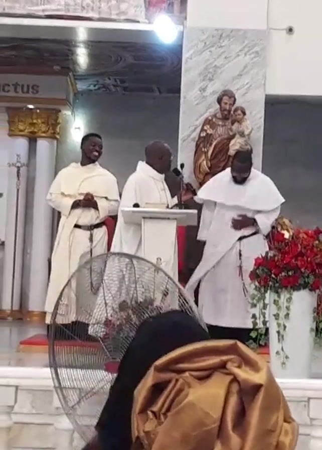 In a church, three men, likely priests, stand on an elevated platform. All are dressed in white clerical robes, and two are wearing rosaries. One priest stands at a lectern, speaking into a microphone. Another stands to his right and is smiling. The third priest stands to the left, appearing to adjust his robes. Behind them, a painting of Joseph and Jesus hangs on the wall. To their right is a large vase of red flowers. In the foreground, a large fan is visible, along with the heads of people in the congregation, including one person with a gold headscarf. Appreciative clapping can be heard.