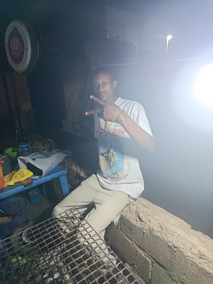 This nighttime image depicts a lone male subject seated on a low, rough concrete ledge. The man, with short dark hair and a light complexion, wears a white t-shirt with a graphic design featuring a landscape, light-colored trousers, a beaded necklace, and multiple beaded bracelets on his left wrist. He is shown with a subtle smile, looking directly at the camera, his right hand raised in a two-finger gesture. To the subject's immediate left, a small blue painted wooden table supports a white paper bag, a yellow plastic bag, a green bowl, and various plastic containers, some with blue lids. Beneath the table, a dark blue plastic basket containing indistinct items is visible. In the foreground, a metal grate grill contains glowing embers, ash, and small green vegetable remnants, indicating recent or current use for cooking. In the upper left background, a round, illuminated sign displaying "33 EXPORT" in red lettering on a white background is mounted. The scene is primarily illuminated by a strong, artificial light source originating from the right, causing significant lens flare across the image. A faint, distant street light is also visible in the upper right. The environment appears to be an outdoor or semi-enclosed commercial space, such as a local eatery or barbecue spot. The specific location within Jos, Nigeria, is not identifiable from the visual content, but the establishment's style is consistent with typical local venues found in Nigerian cities.
